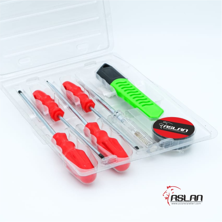 2 adet düz tornavida ; 2 adet yıldız tornavida ; 1 adet kontrol kalemi ; 1 adet maket bıçağı ; 1 adet elektrik bandı ;